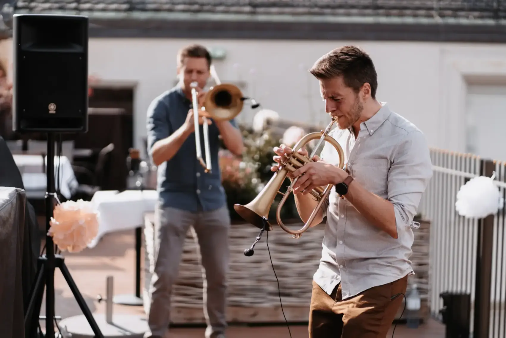 Unsere Begeisterung und Freude an der Musik mit Euch zu teilen, ist für uns das schönste Gefühl – das ist es, was uns antreibt und lieben lässt, was wir tun. Wir sind Johannes und Jonas, Zwillingsbrüder aus München und unsere Leidenschaft ist es, bekannte Songs mit Trompete, Flügelhorn und Posaune in einer einzigartigen Soundmischung aus Jazz und Funk neu zu interpretieren. Was uns besonders macht? Wir arrangieren, recorden und produzieren unsere Begleitung komplett selbst, wodurch wir unseren unverwechselbaren Sound verwirklichen. Bei Live-Auftritten verwenden wir ein spezielles Looping-Setup, bei dem wir zuvor eingespielte Loops individuell miteinander kombinieren und so die Musik kreativ im Moment entstehen lassen. Dadurch klingen wir zu zweit wie eine volle Band.